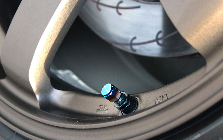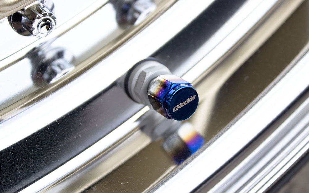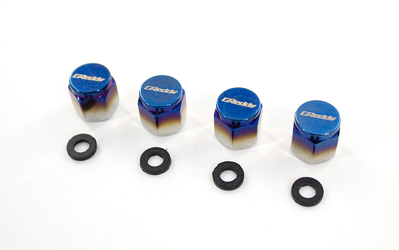◆ Titanium gradient air valve caps with GReddy logo.