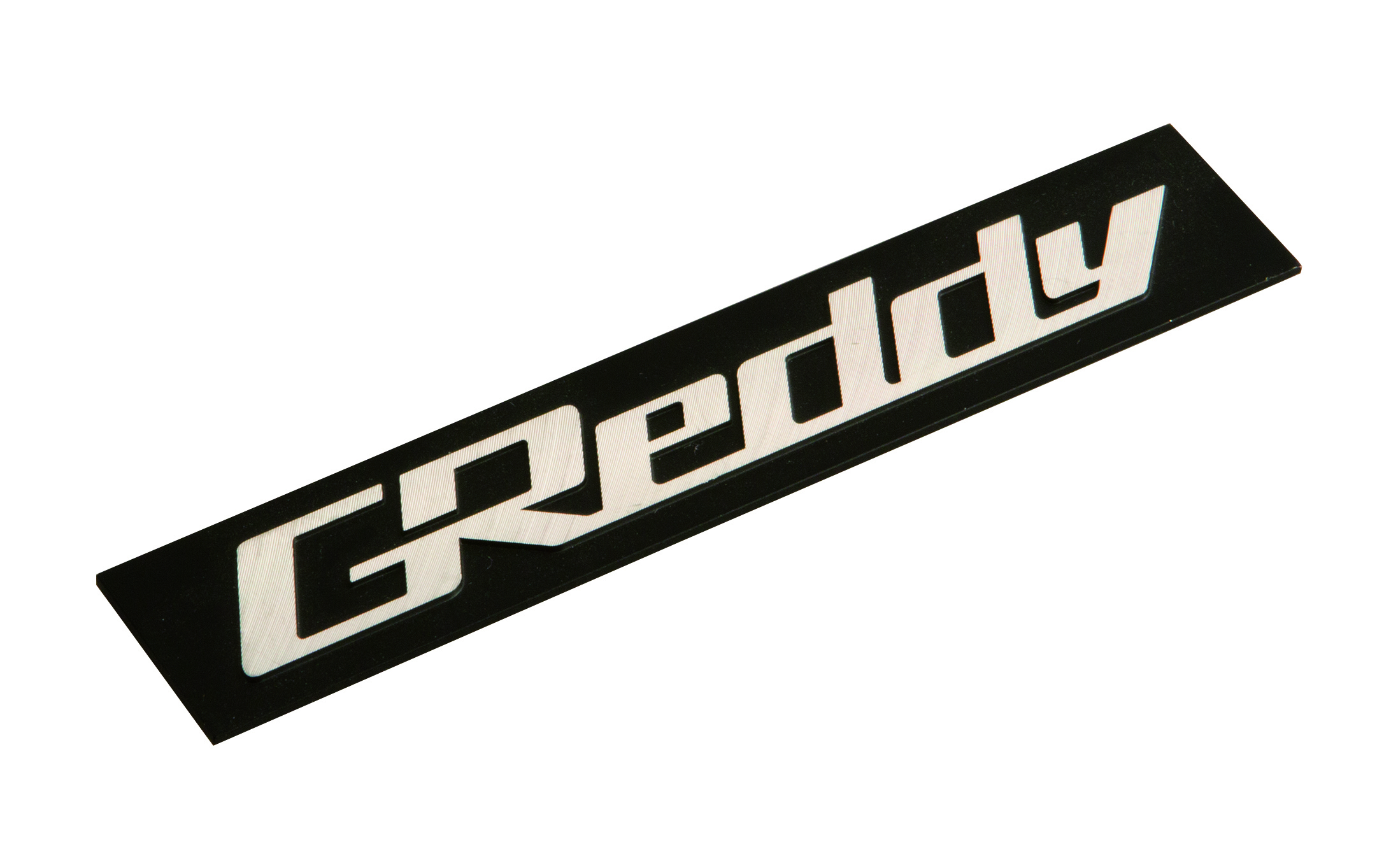 •An aluminum emblem with the GReddy logo embossed on a black background.