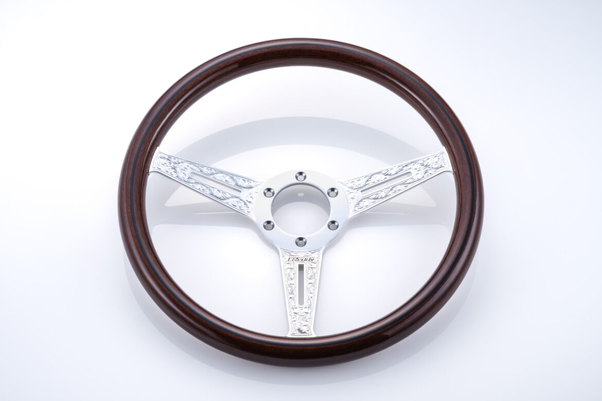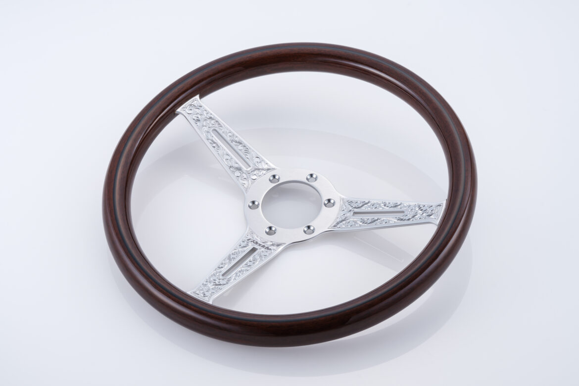 This is a set product featuring the steering wheel body with engraving work applied to the spokes.